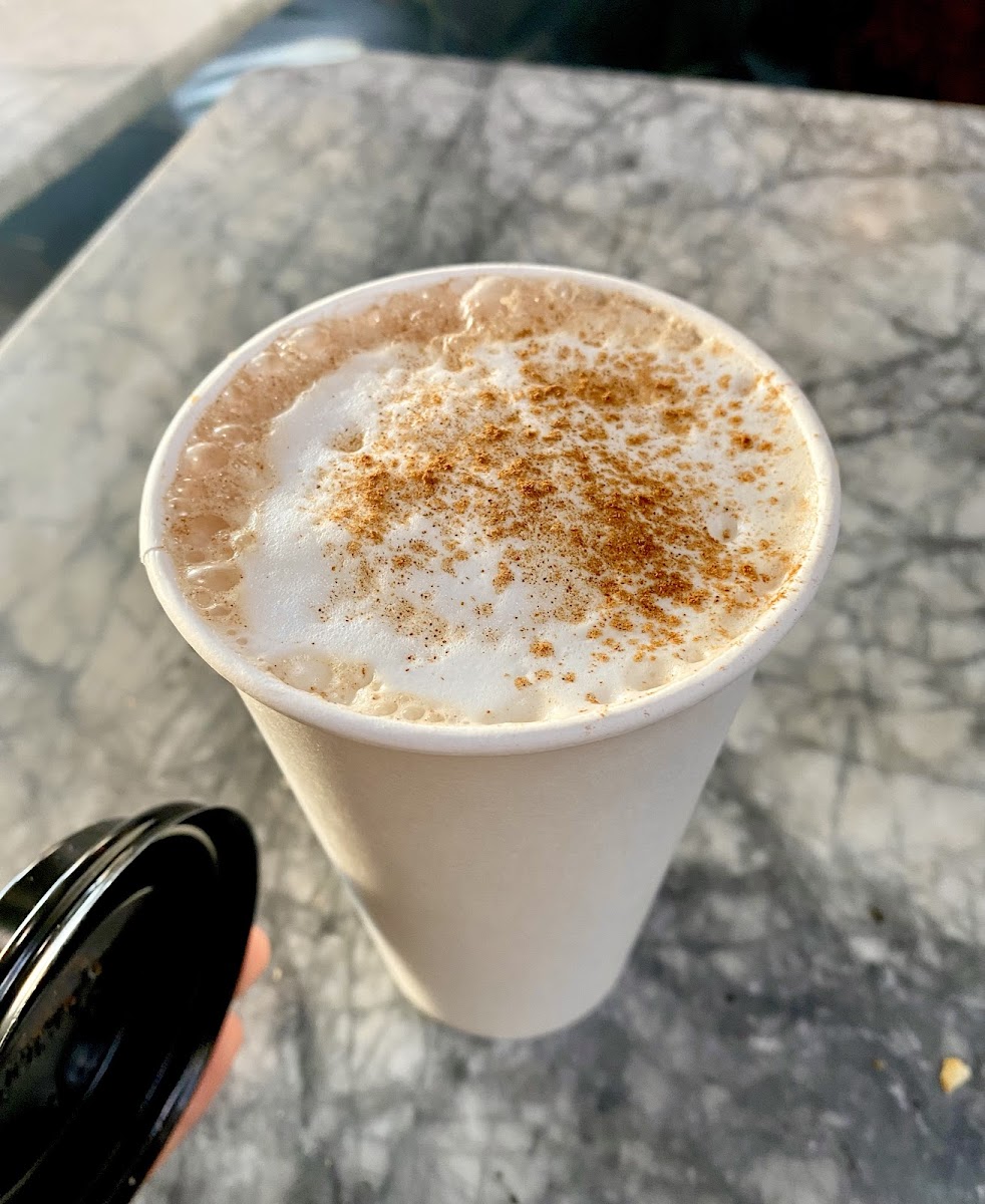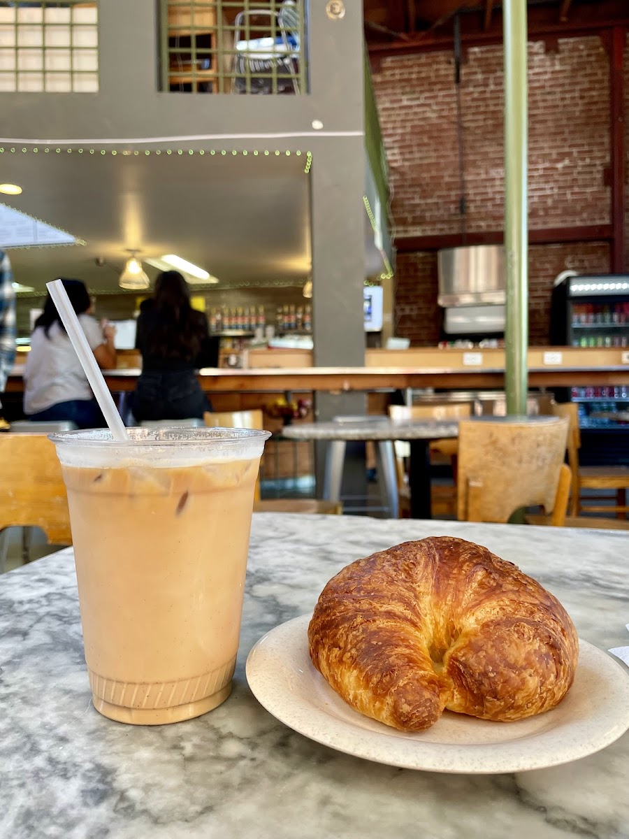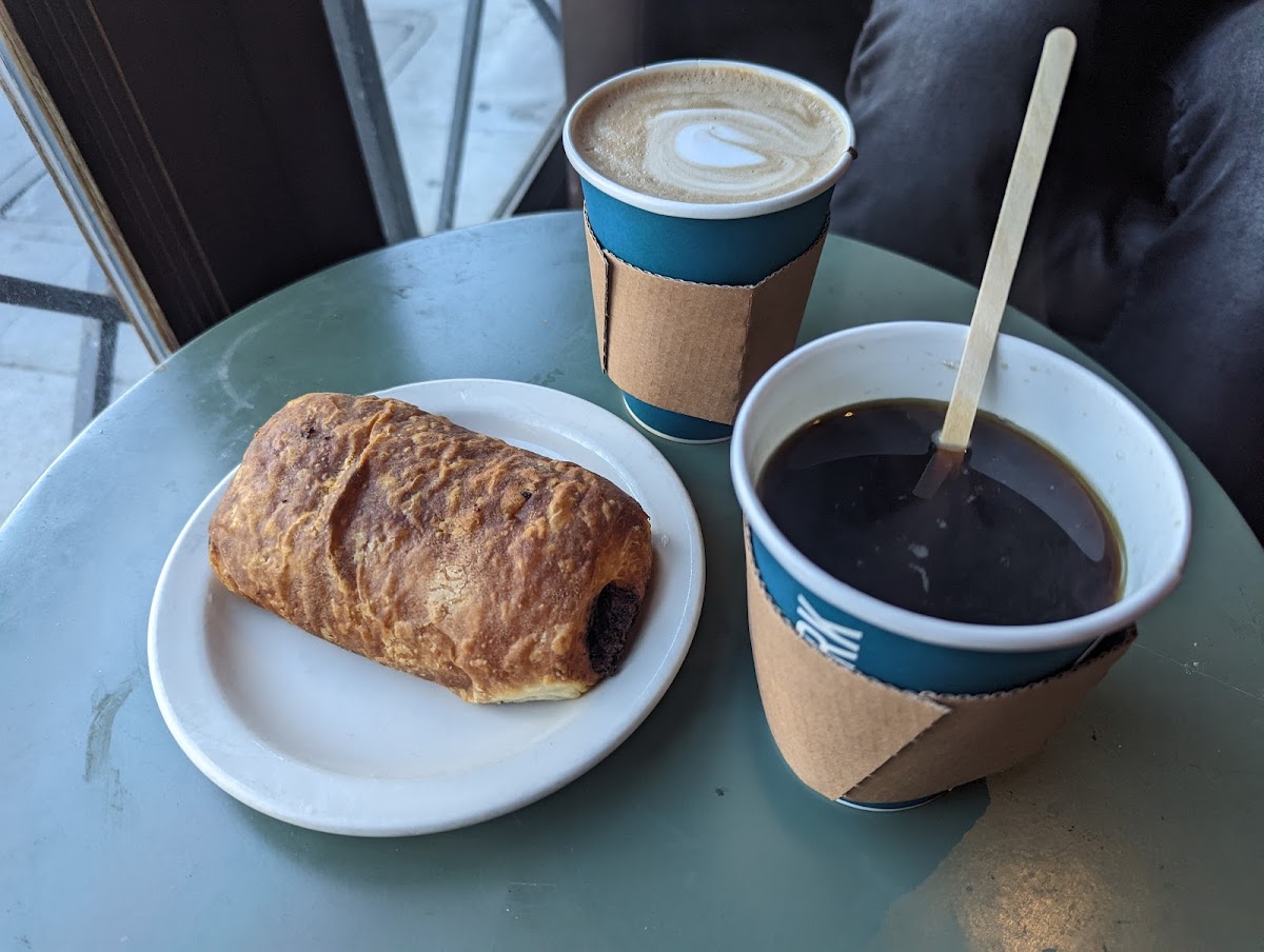 Cozy cafe to sit for a book or work on some project. They have very good apple croissants. Get it with your coffee. Hot latte is a good deal that comes in a big cup so it lasts for while if you plan to stay long.